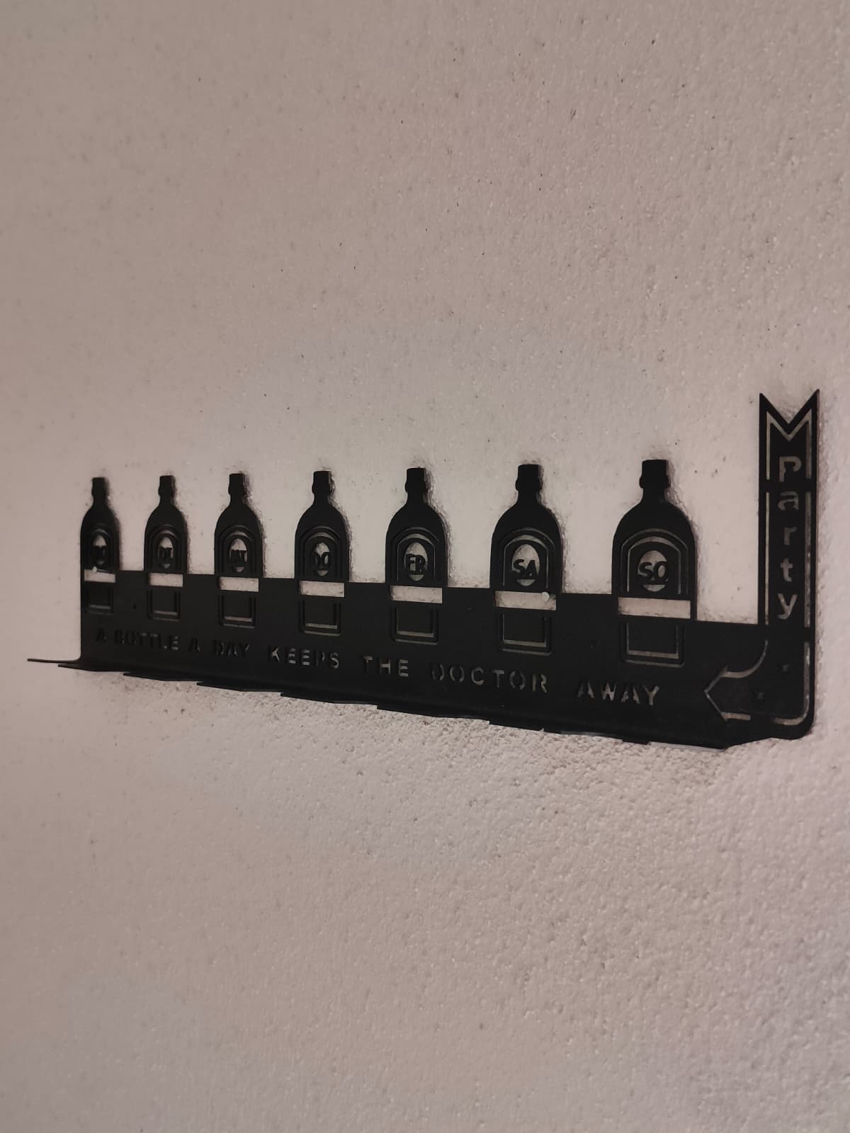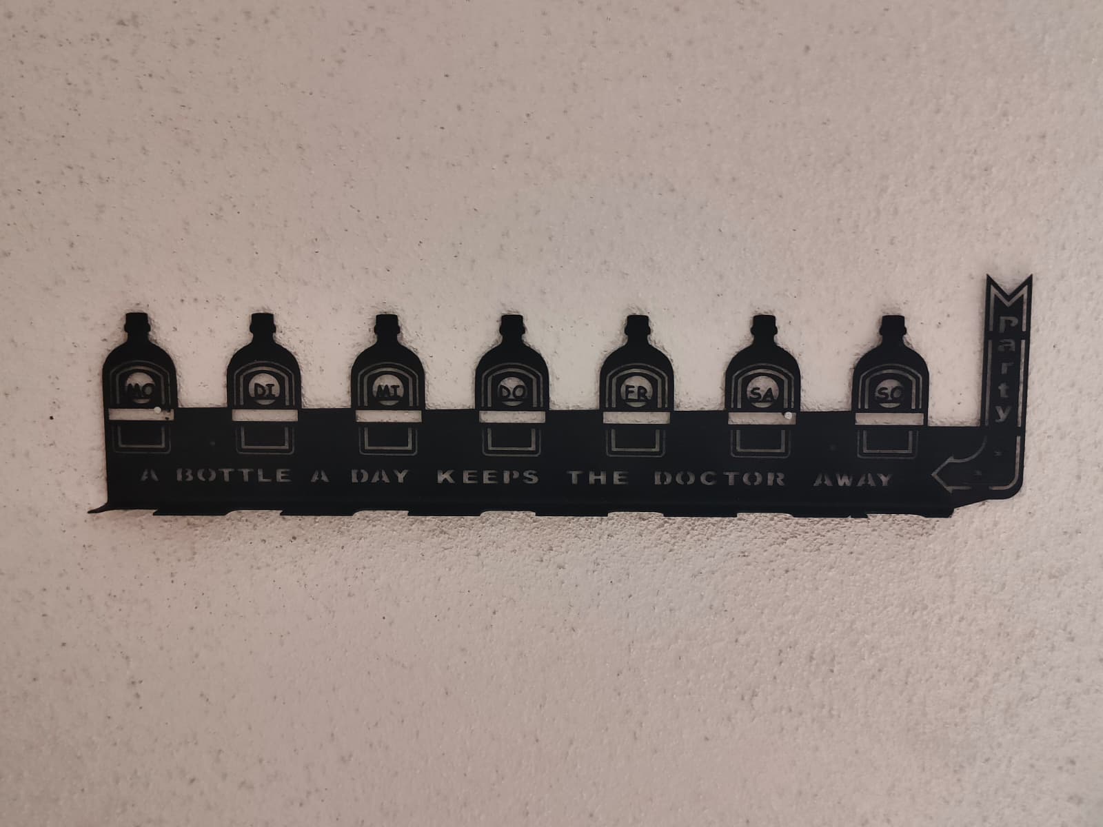 Begeistere Deine Freunde und Familie mit unserem handgefertigten Flaschenregal inklusive Wochen-Getränkeplaner. Ob Vatertag, Junggesellenabschied oder Weihnachtsmarkt – dieses Unikat aus Franken vereint Funktionalität und Humor in einem stilvollen Metall-Design.